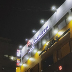 프렌차이즈 매장 시공 사례- 메인채널간판- 곡각지점 서브채널간판-채널간판 위 투광기 취부-그라데이션 시트작업-실사출력 시트..